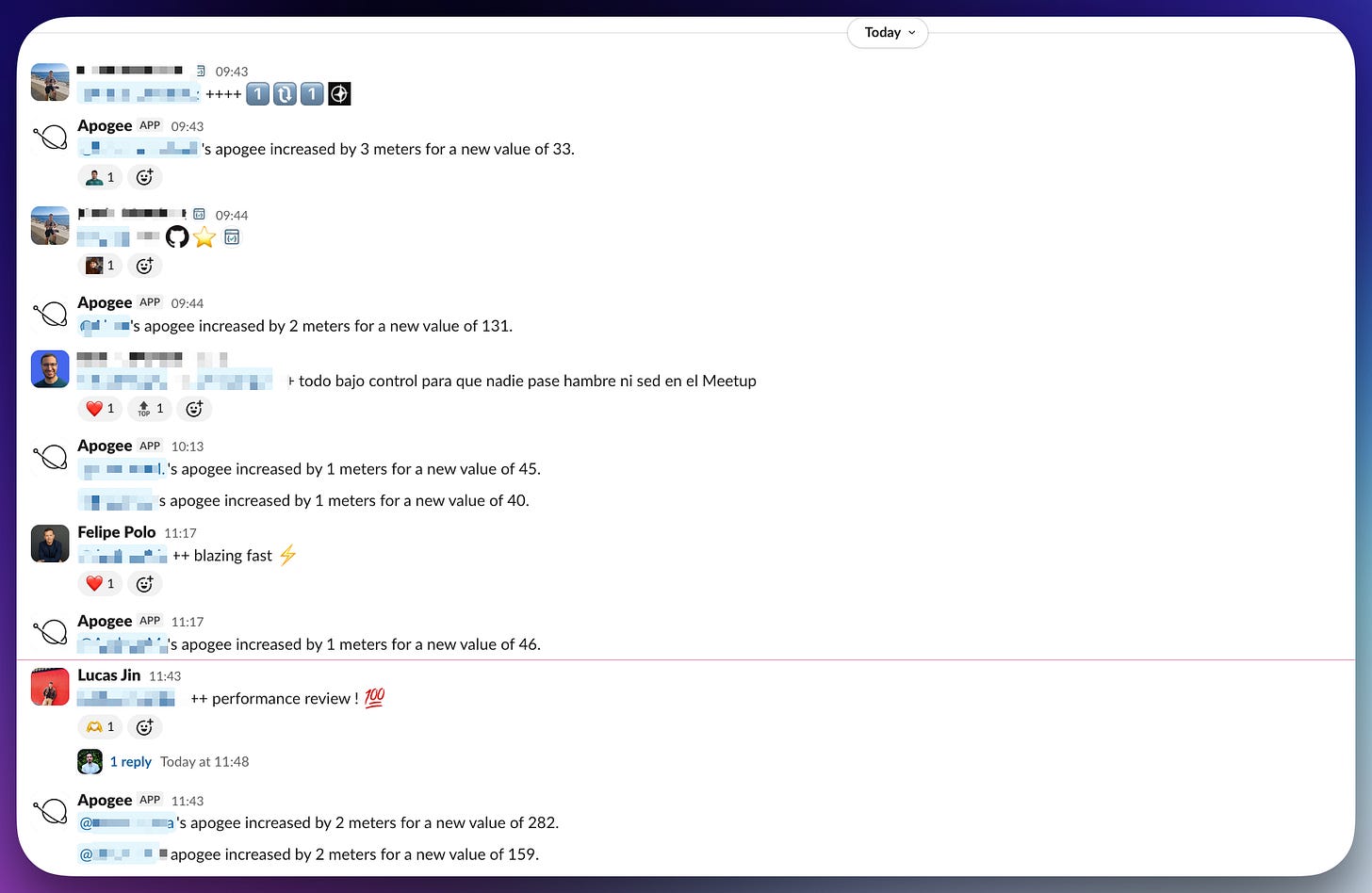 Un equipo que se agradece entre sí en público mantiene la moral alta y alimenta la inercia de querer seguir ayudándose. En nuestro slack tenemos un canal dedicado a agradecimientos, gamificado con Apogee: un bot que permite dar y recibir “metros”.